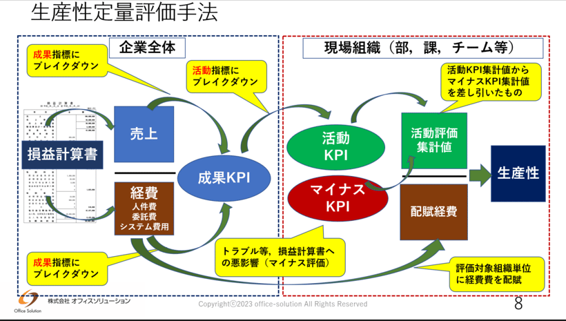 提案手法は、「売上増加」「経費維持・削減」などのコア活動と、それらを促進する改善活動の実績値を使い、オフィスワークにおける生産性を客観的に評価するものです。